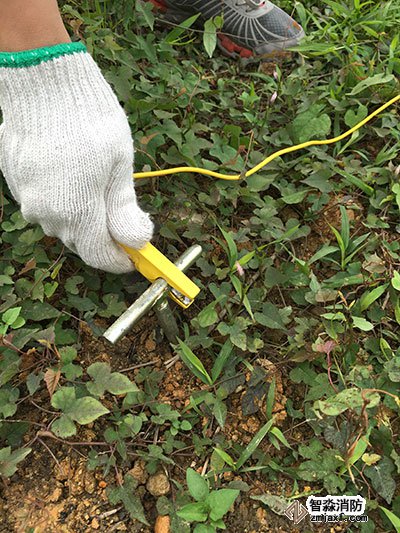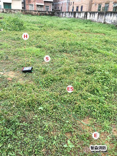 把接地棒打到土壤下,線(xiàn)上有鉗子的一端鉗住接地棒,還要再打三根接地棒。共:紅,黃,綠,黑四根線(xiàn)。接地線(xiàn)的按照H,S,ES,E順序成一直線(xiàn)排列,每個(gè)接地棒之間距離為5米