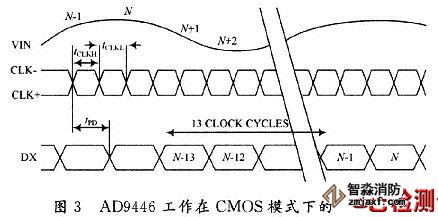AD9446芯片的控制時序與傳統的低速A/D有所不同,它完全依靠時鐘來控制其采樣、轉換和數據輸出。AD9446通常在CLK第一個時鐘的上升沿開始采樣轉換,并在經過延遲tpd后,開始輸出數據。而數據則在第13個時鐘到來時才出現在D15~D0端口上。圖3是AD9446工作在CMOS模式下的時序圖。