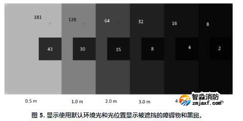 我們通過使用恒定的煙灰密度和距離觀察者越來越遠的白色障礙物來驗證遮蔽問題。障礙物的強度隨著光穿過煙霧的距離而正確降低。我們還使用在白色障礙物上顯示黑色斑塊的圖像驗證了計算出的能見度。在這種情況下,黑色補丁和白色背景都被煙霧同等地遮住了,因此韋伯對比度是恒定的,似乎不適用于這種情況。