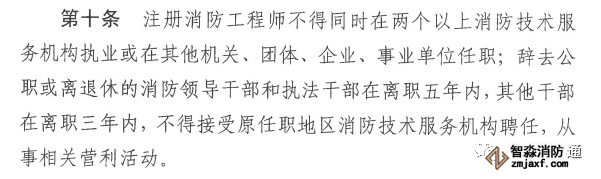 第十條《136號令》和《143號令》就有明確規(guī)定,注冊消防工程師不得在兩個及以上機構(gòu)執(zhí)業(yè),這里再次重申,那么換個角度,對于注冊消防工程師的數(shù)量需求會劇增!同時,后面提到相應(yīng)的干部一定年限內(nèi)不得在原機構(gòu)聘任,為啥?防止權(quán)錢交易,不多說,大家都懂的!