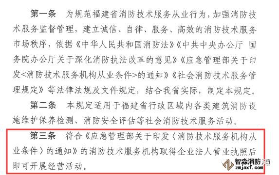第二條 本條說的很明確,結(jié)合本省規(guī)定作出。相信,福建省開了先河,很快各省都會出臺適合自己的從業(yè)規(guī)定,可以說福建省的這個規(guī)定文件為目前比較混亂的消防行業(yè)初步豎立了準則。