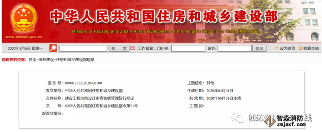 2019年5月10日,司法部法制信息網(wǎng)公開征求意見系統(tǒng),面向全社會公開征求《建設(shè)工程消防設(shè)計審查和驗收管理規(guī)定(征求意見稿)》意見。時隔半年后,標題最終修改為《建設(shè)工程消防設(shè)計審查驗收管理暫行規(guī)定》(以下簡稱《規(guī)定》),并于2020年4月4日,已經(jīng)住房和城鄉(xiāng)建設(shè)部部務(wù)會議審議通過,以住房和城鄉(xiāng)建設(shè)部令第51號發(fā)布,并自2020年6月1日起施行。新規(guī)明確了履行消防設(shè)計審查驗收,備案抽查職責的同時,增加了優(yōu)化營商環(huán)境、工程建設(shè)項目審批制度改革等內(nèi)容。
