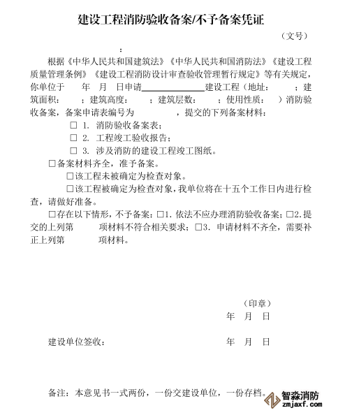 第三十五條 消防設(shè)計(jì)審查驗(yàn)收主管部門收到建設(shè)單位備案材料后,對備案材料齊全的,應(yīng)當(dāng)出具備案憑證;備案材料不齊全的,應(yīng)當(dāng)一次性告知需要補(bǔ)正的全部內(nèi)容。