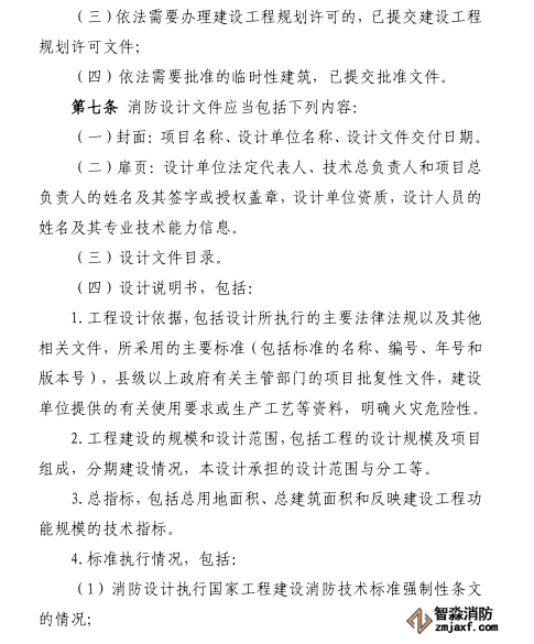 (一)按照建設(shè)工程法律法規(guī)和國家工程建設(shè)消防技術(shù)標(biāo)準(zhǔn)進(jìn)行設(shè)計(jì),編制符合要求的消防設(shè)計(jì)文件,不得違反國家工程建設(shè)消防技術(shù)標(biāo)準(zhǔn)強(qiáng)制性條文;