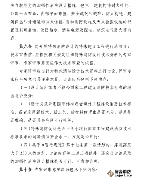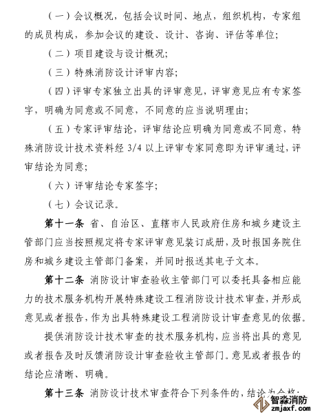 評審專家應(yīng)當(dāng)符合相關(guān)專業(yè)要求,總數(shù)不得少于七人,且獨(dú)立出具評審意見。特殊消防設(shè)計(jì)技術(shù)資料經(jīng)四分之三以上評審專家同意即為評審?fù)ㄟ^,評審專家有不同意見的,應(yīng)當(dāng)注明。省、自治區(qū)、直轄市人民政府住房和城鄉(xiāng)建設(shè)主管部門應(yīng)當(dāng)將專家評審意見,書面通知報(bào)請?jiān)u審的消防設(shè)計(jì)審查驗(yàn)收主管部門,同時(shí)報(bào)國務(wù)院住房和城鄉(xiāng)建設(shè)主管部門備案。