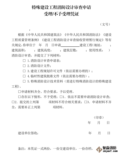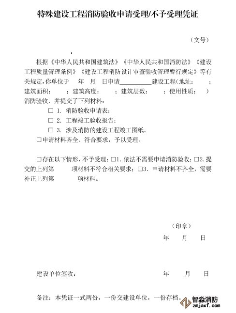 消防設(shè)計(jì)審查驗(yàn)收主管部門收到建設(shè)單位提交的消防驗(yàn)收申請后,對申請材料齊全的,應(yīng)當(dāng)出具受理憑證;申請材料不齊全的,應(yīng)當(dāng)一次性告知需要補(bǔ)正的全部內(nèi)容。