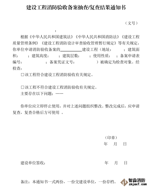 消防設(shè)計(jì)審查驗(yàn)收主管部門應(yīng)當(dāng)自其他建設(shè)工程被確定為檢查對象之日起十五個(gè)工作日內(nèi),按照建設(shè)工程消防驗(yàn)收有關(guān)規(guī)定完成檢查,制作檢查記錄。檢查結(jié)果應(yīng)當(dāng)通知建設(shè)單位,并向社會(huì)公示。