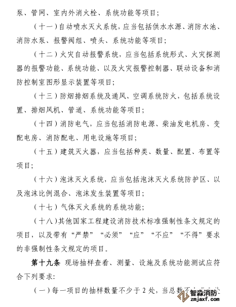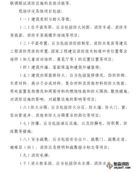第二十九條 消防設(shè)計(jì)審查驗(yàn)收主管部門受理消防驗(yàn)收申請后,應(yīng)當(dāng)按照國家有關(guān)規(guī)定,對特殊建設(shè)工程進(jìn)行現(xiàn)場評定。現(xiàn)場評定包括對建筑物防(滅)火設(shè)施的外觀進(jìn)行現(xiàn)場抽樣查看;通過專業(yè)儀器設(shè)備對涉及距離、高度、寬度、長度、面積、厚度等可測量的指標(biāo)進(jìn)行現(xiàn)場抽樣測量;對消防設(shè)施的功能進(jìn)行抽樣測試、聯(lián)調(diào)聯(lián)試消防設(shè)施的系統(tǒng)功能等內(nèi)容。