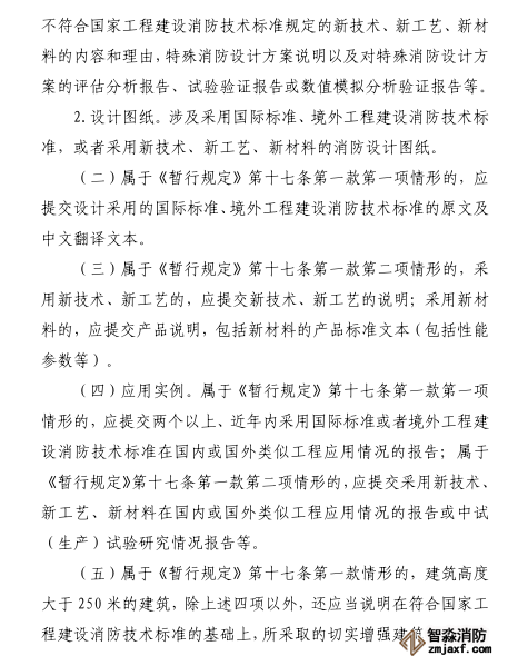 (二)消防設(shè)計(jì)文件擬采用的新技術(shù)、新工藝、新材料不符合國家工程建設(shè)消防技術(shù)標(biāo)準(zhǔn)規(guī)定的。